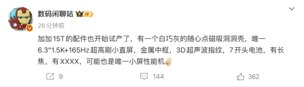 据CNMO了解牛博,此前该博主曾曝光了一加15T配置信息。在屏幕方面,一加15T将配备一块6.3英寸1.5K直屏,支持165Hz的超高刷新率,并且有望采用极窄四等边的设计,为用户带来更加沉浸、流畅的视觉体验。